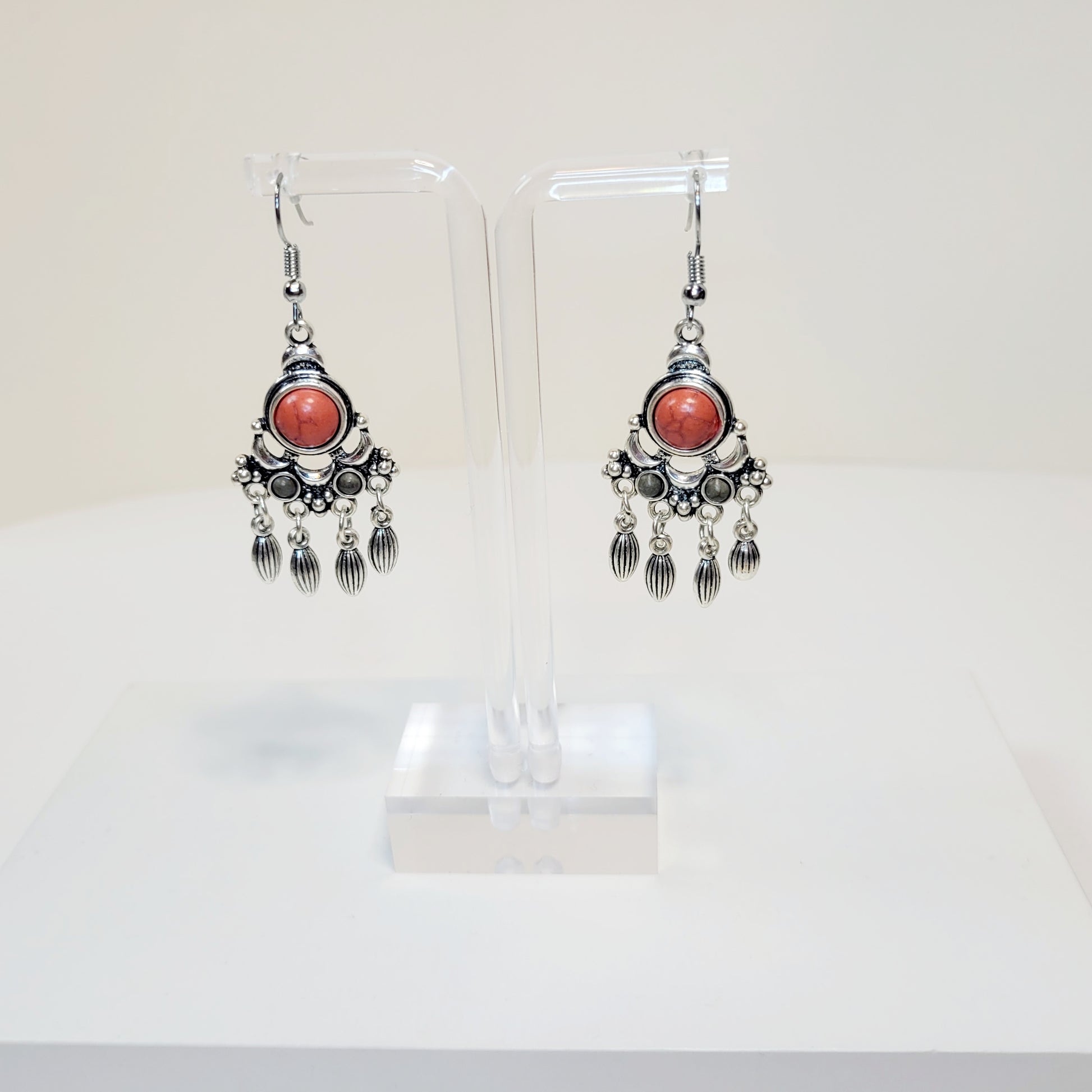 Enhance your jewelry collection with these stunning bohemian drop earrings, featuring vibrant orange and green stones that add a touch of earthy elegance. Perfect for free-spirited fashion lovers, these earrings blend natural charm with artistic craftsmanship. The earrings are 2 inches long.
