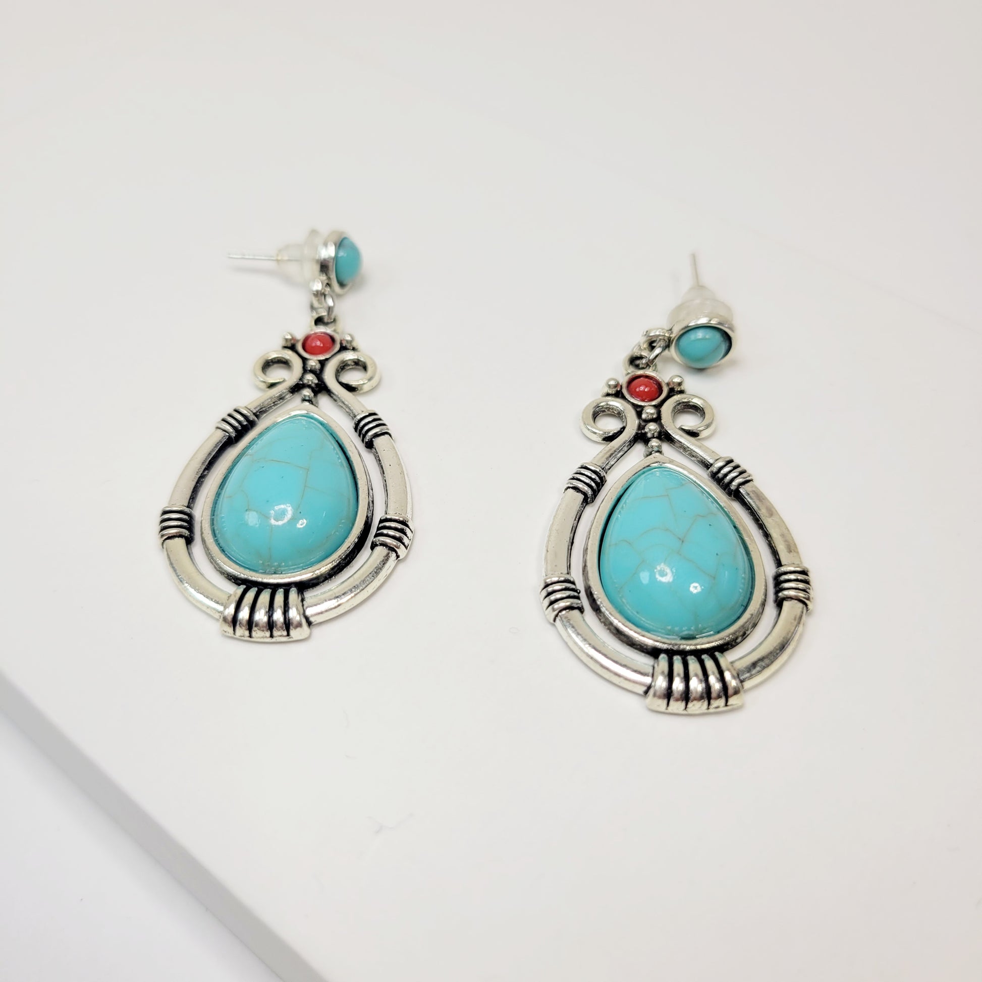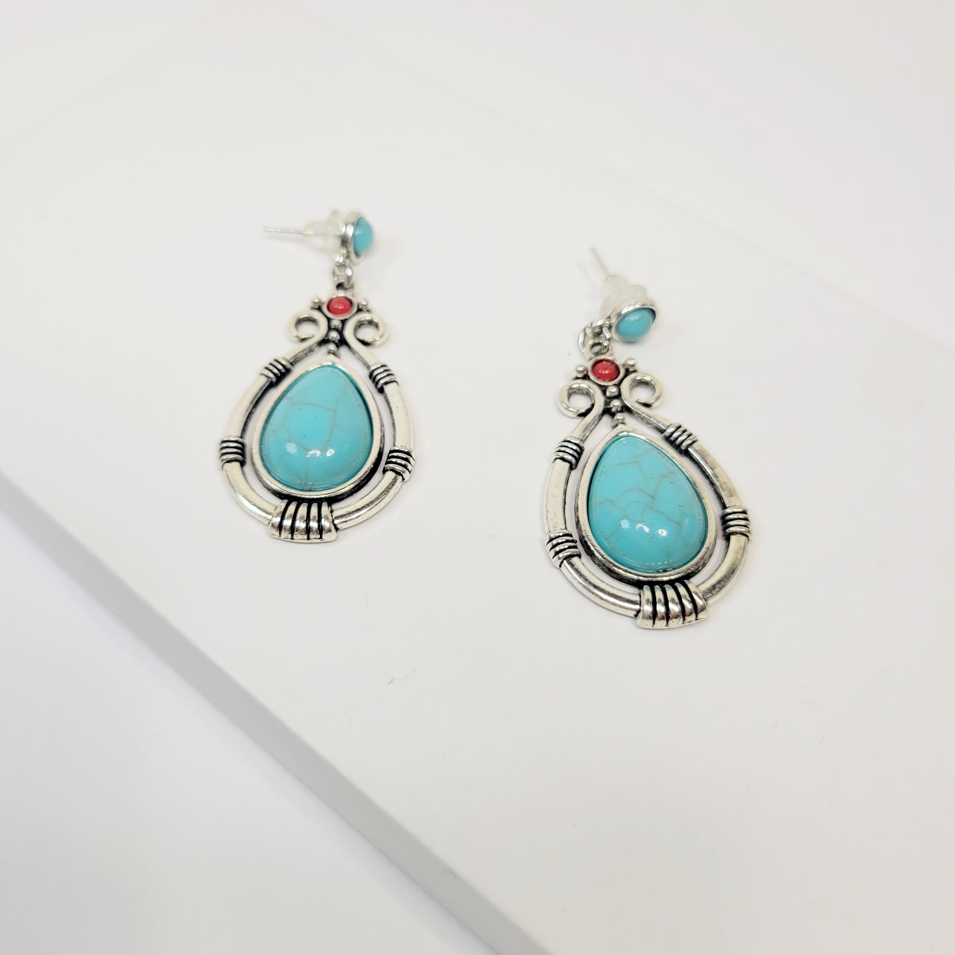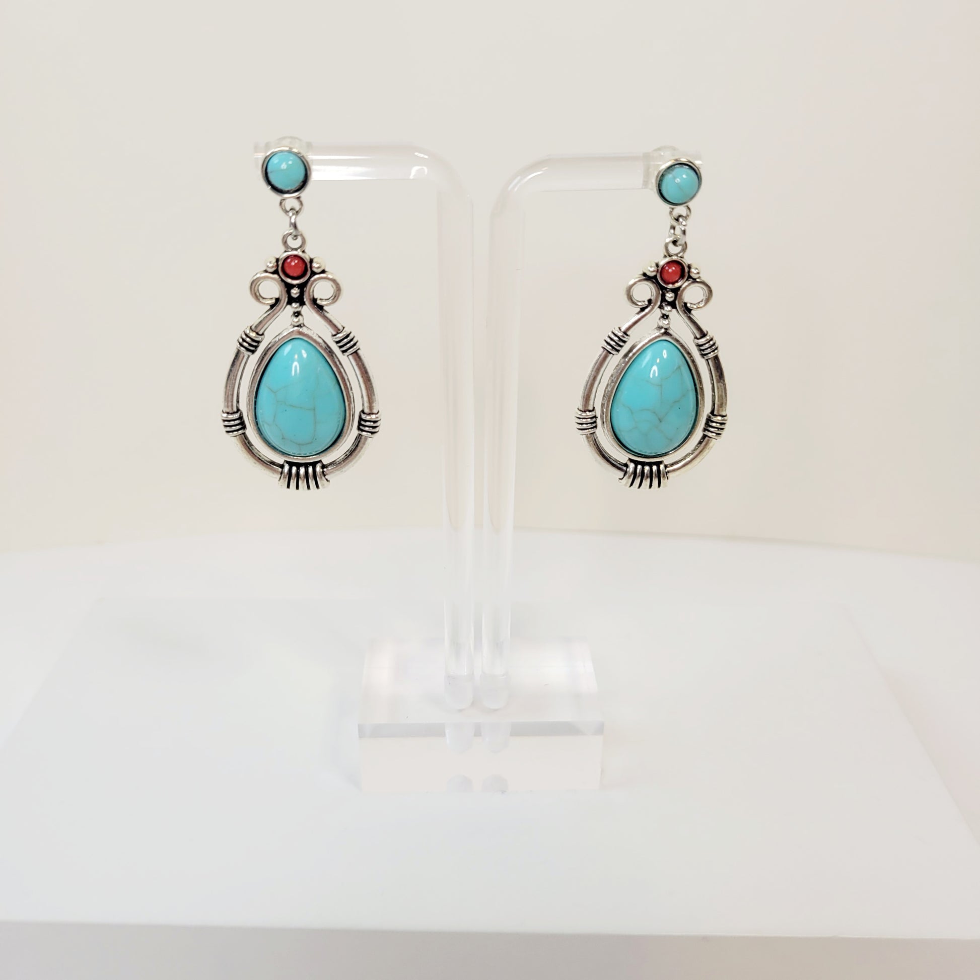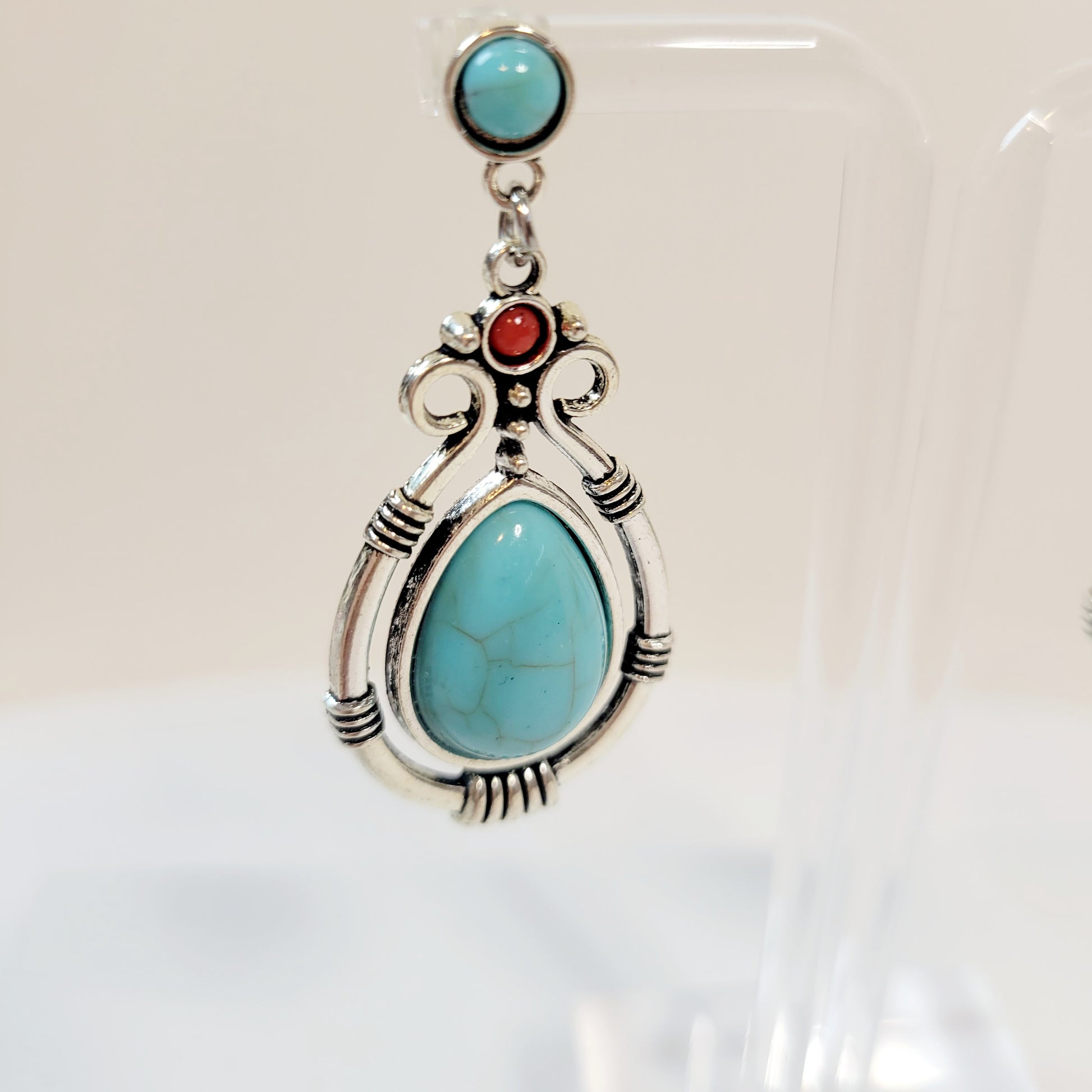 Bring a bit of free-spirited charm to your jewelry box with these beautifully design earrings. Featuring vibrant turquoise and red stones set to contrast with the silver-toned details.