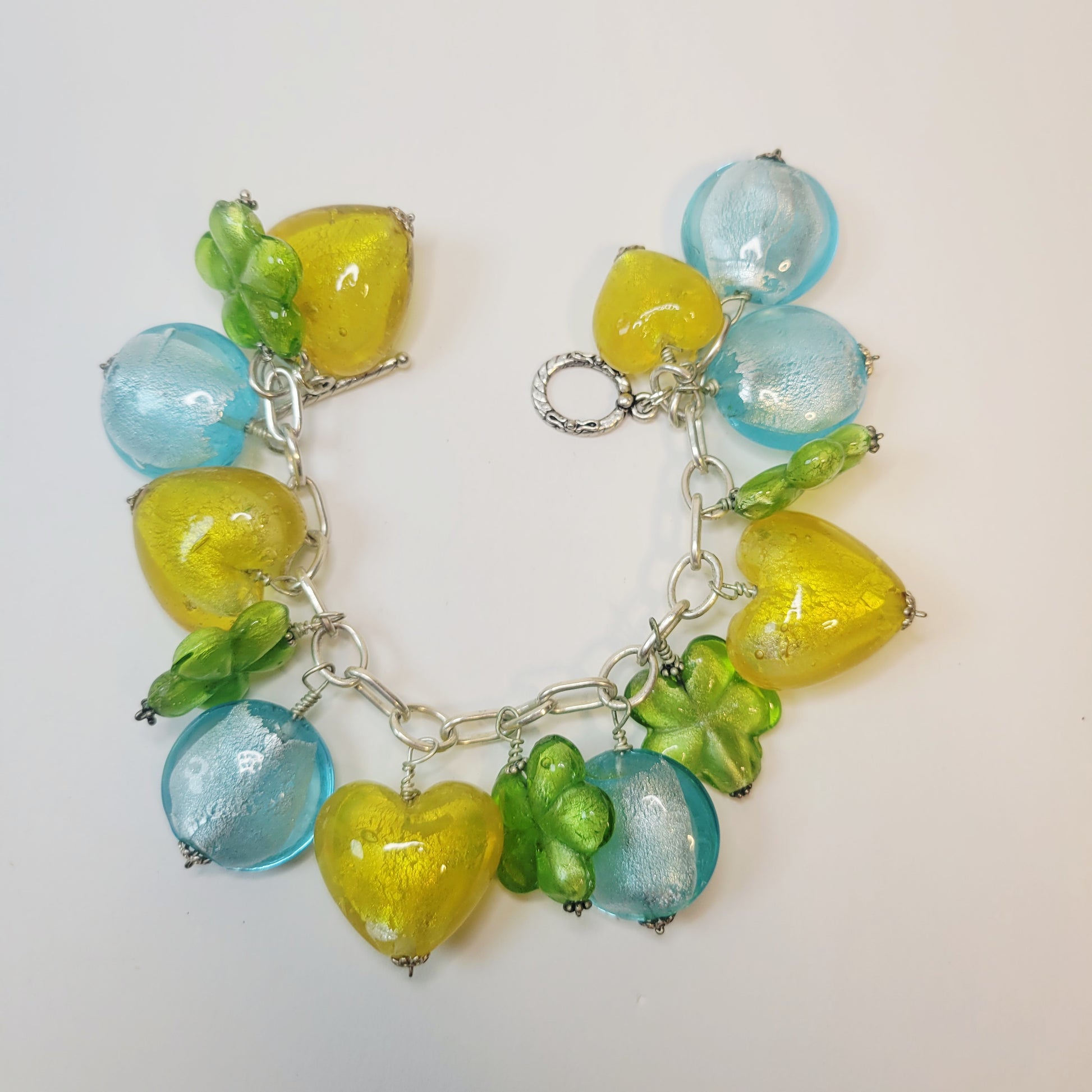 Murano-Style Bead Bracelet. Handcrafted, with blue, yellow and green beads.