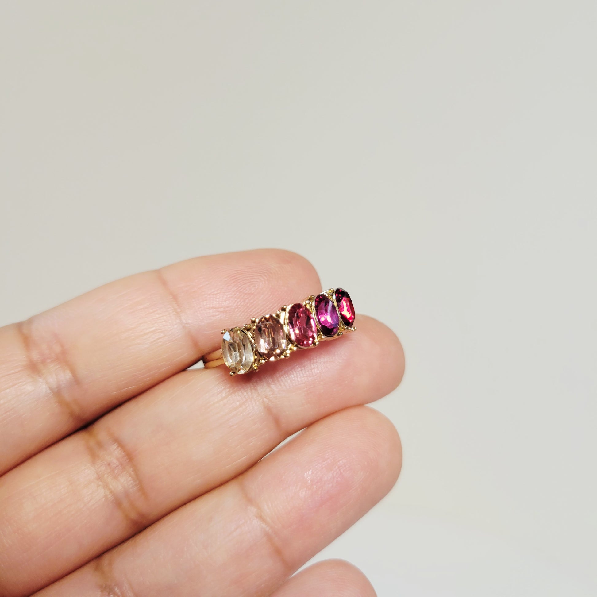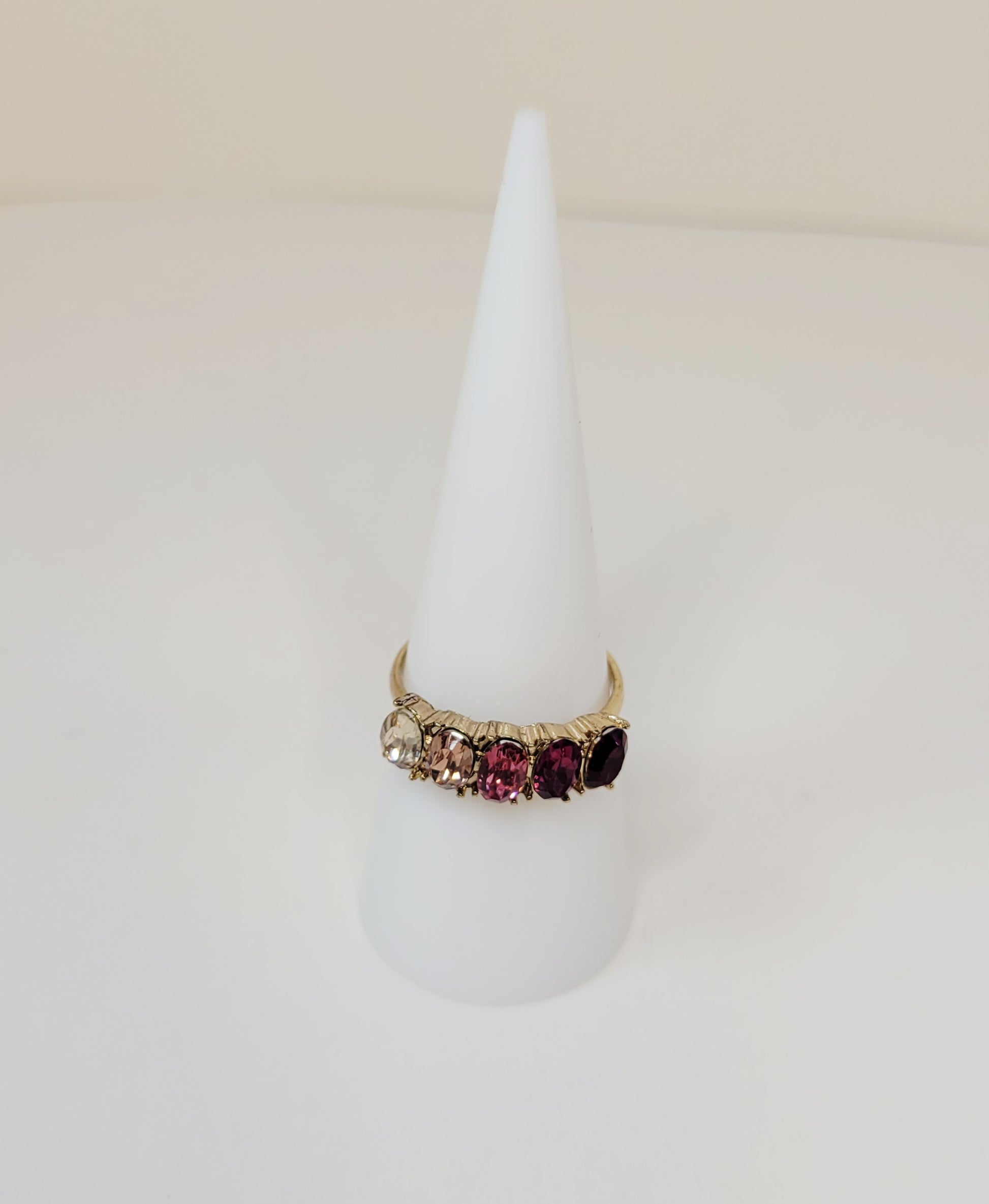 This ring has 5 rhinestones in different pink hues, set on a gold-toned band. The ring is a size 8 but can be extended a little as it is open in the back of the band.