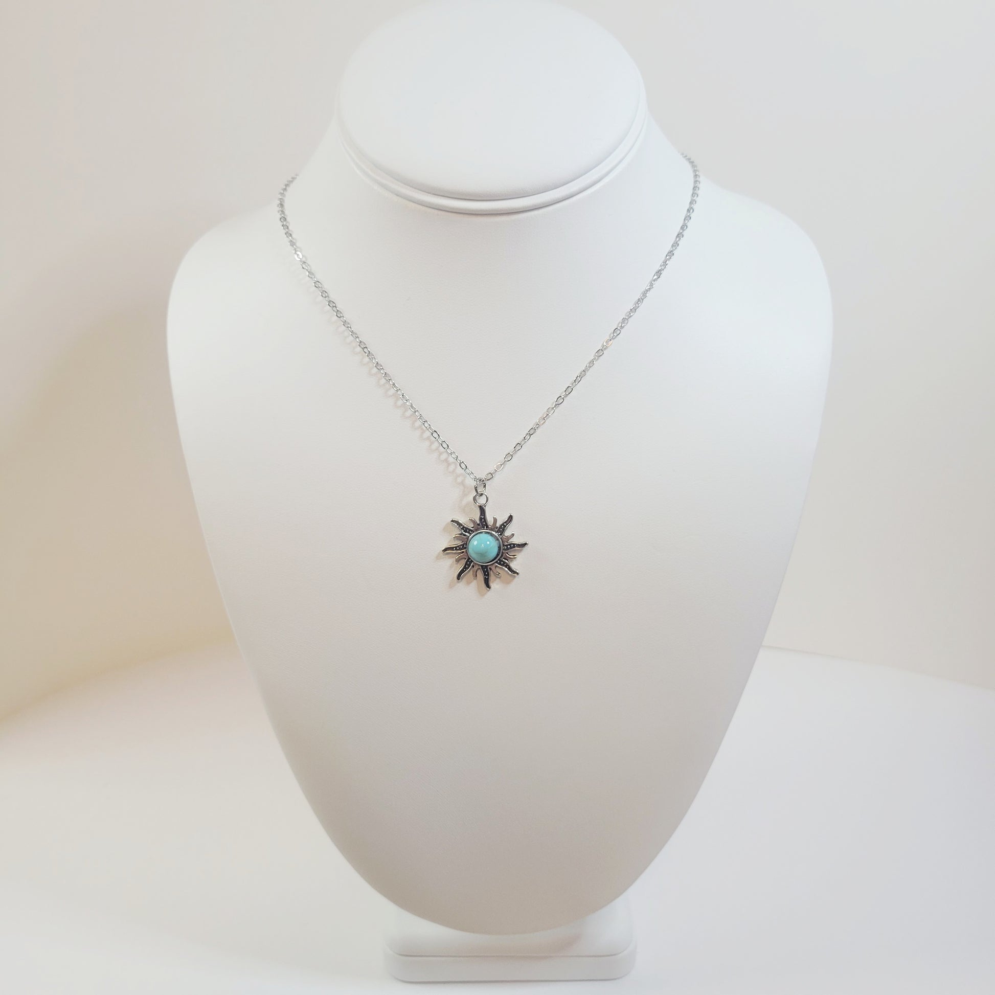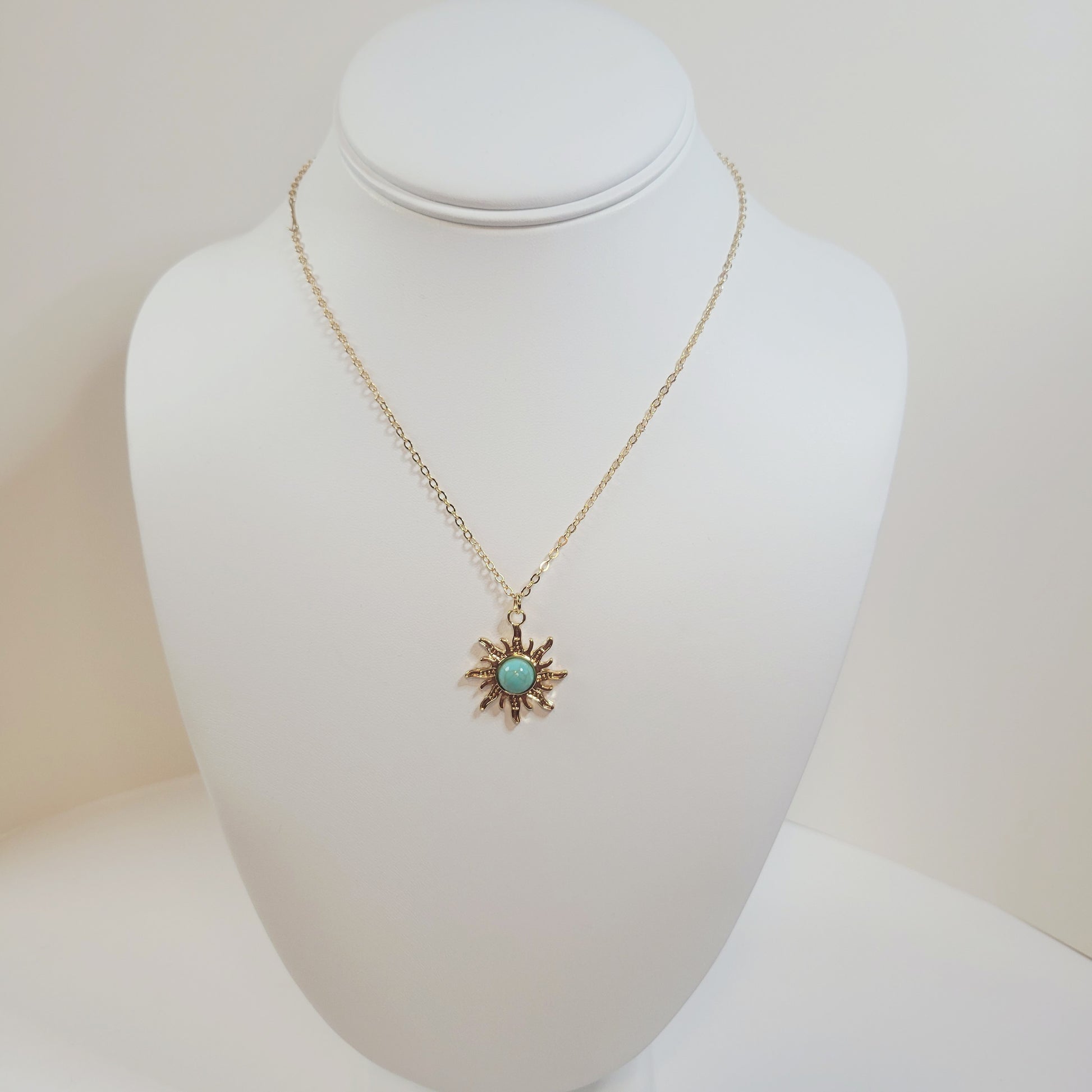 Gold-toned. Turquoise stone sun pendant. Measure: 9 inches
